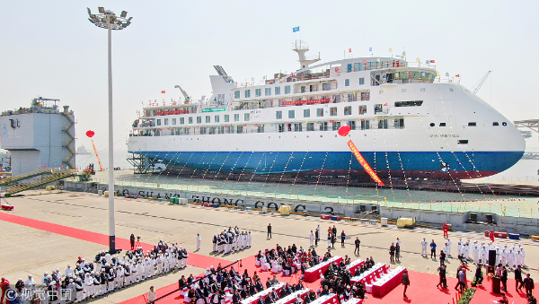 NANJING -- The first China-made cruise ship for polar expeditions tested the water on Tuesday in Haimen, East China's Jiangsu province.