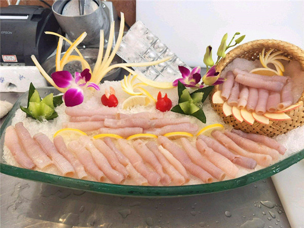 Guangxi’s coastal cities Fangchanggang and Beihai have an abundance of high quality seafood, and the most renowned one is sandworm sashimi, which will make your mouth water. The dish uses high quality sandworms found in fresh water in offshore areas. With a fine, smooth, sweet, crisp, and delicious flavor, sandworm sashimi enjoys a strong reputation in Guangxi, and it has the effect of tonifying the spleen and the kidney, invigorating qi, and replenishing blood.