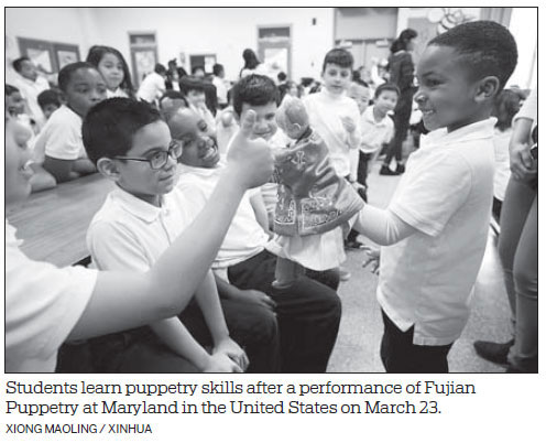 WASHINGTON - When Chen Lihui, a performer of Fujian Puppetry, a Chinese performance art, simultaneously maneuvered the head of his 18-inch puppet back and forth, its legs kicking high, and its hands wiping the dust off the brim of its hat, 200 children burst into laughter.