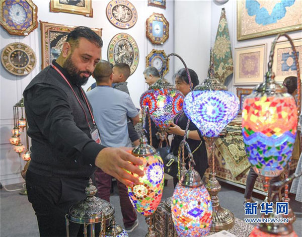 A merchant selects Persian style lighting decorations at an Iranian booth amid the the fifth Maritime Silk Road Brands Expo in Shishi of Quanzhou, in East China's Fujian province on April 18. [Photo/Xinhua]