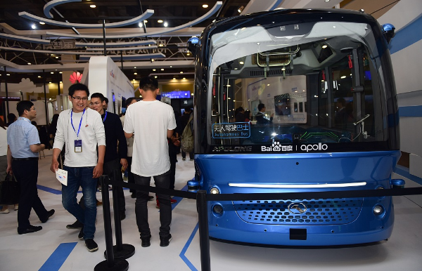 The Apollo autonomous bus of Baidu Inc is displayed at the AI Expo 2019 in Suzhou, East China's Jiangsu province, on May 9, 2019. [Photo/VCG]