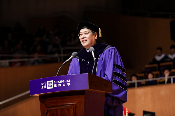 Yu Lizhong, chancellor of NYU Shanghai, speaks at a recent graduation ceremony. [Photo provided to China Daily]