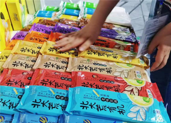 Rice produced in Beidahuang, Northeast China’s Heilongjiang province, is on display at the 6th China-Russia Expo and 30th China Harbin International Economic and Trade Fair. [Photo/dbw.cn]