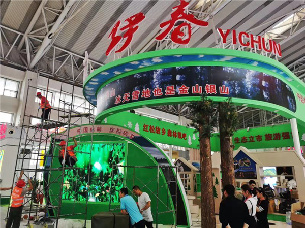 The exhibition booth for Yichuan city, Heilongjiang province is prepared on June 13. [Photo/dbw.cn]