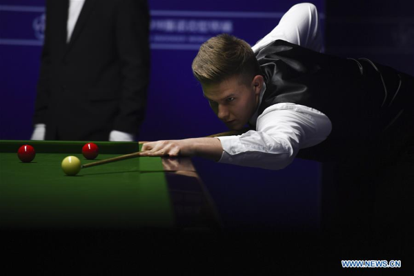Adam Stepanow of Poland competes during the group match between Adam Stepanow/Kacper Filipiak of Poland and Andreas Ploner/Florian Nussie of Austria at the 2019 Snooker World Cup in Wuxi, East China's Jiangsu province, on June 24, 2019. [Photo/Xinhua]