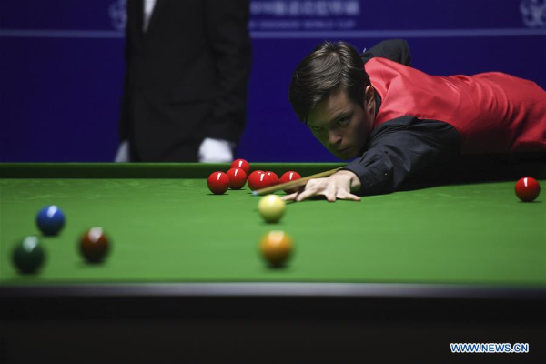Florian Nussie of Austria competes during the group match between Adam Stepanow/Kacper Filipiak of Poland and Andreas Ploner/Florian Nussie of Austria at the 2019 Snooker World Cup in Wuxi, East China's Jiangsu province, on June 24, 2019. [Photo/Xinhua]
