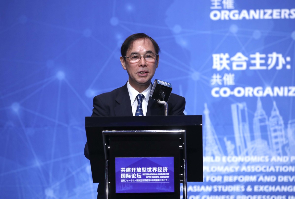 Naoyuki Yoshino, dean of the Asian Development Bank Institute (ADBI), delivers a keynote speech at the International Forum for Open Global Economy in Osaka, Japan, on Tuesday. [Photo by Zou Hong/China Daily]
