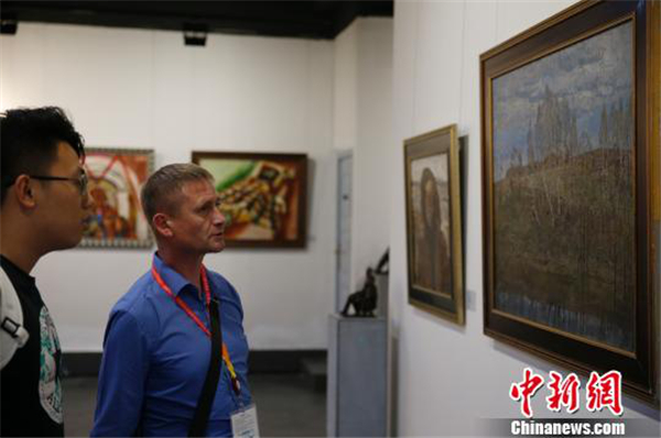 Visitors admire a painting exhibition at the sixth China Russia Expo. [Photo/chinanews.com]