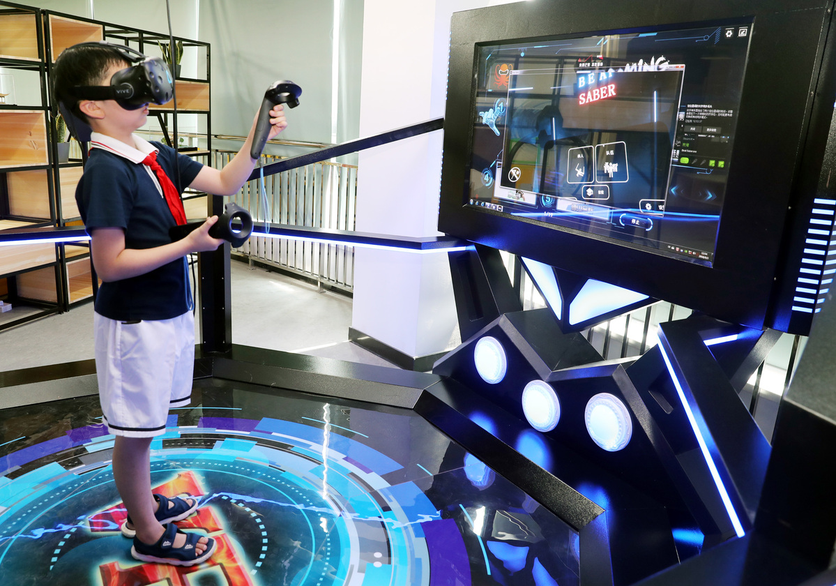 A student tries virtual reality technology in a smart classroom at a primary school in Suzhou, Jiangsu province. [Photo by Hua Xuegen/for China Daily]