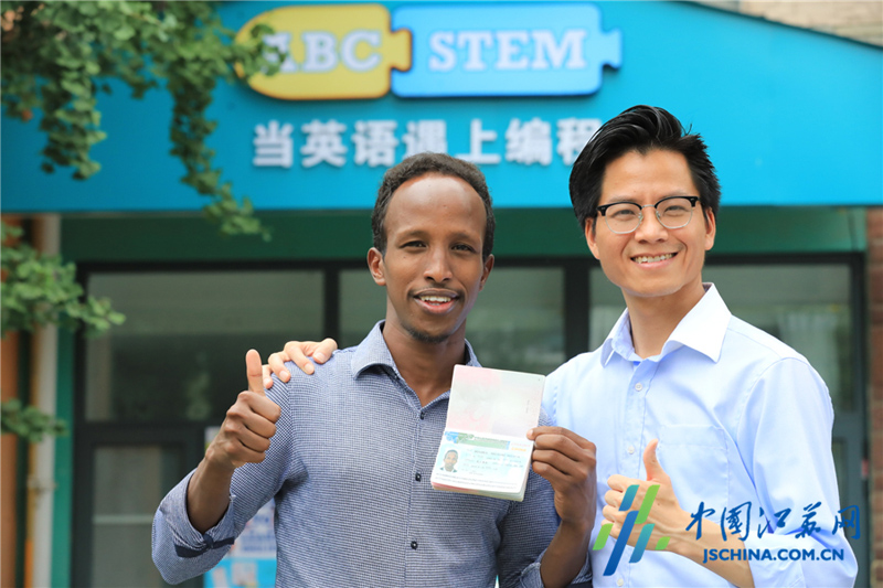 Hussein, with his visa, takes time out with his business partner Zhang Yiming. They work together on ABCSTEM, a program designed to children's capabilities in solving problems and thinking in an innovative, critical and logical way. [Photo by Liu Li/jschina.com.cn]