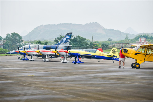 Aerobatic teams prepare for takeoff at the 2019 Guizhou Huangguoshu Waterfalls Flight Conference in Anshun city, Southwest China's Guizhou province. [Photo provided to chinadaily.com.cn]