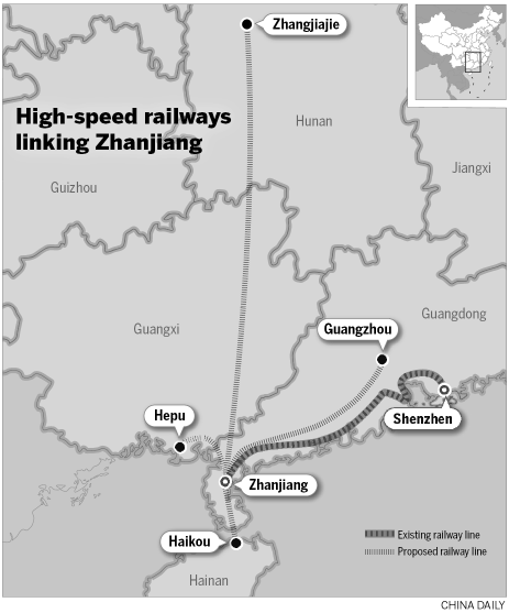 Jiang Jianjun, mayor of Zhanjiang, said the high-speed railway development plan, which includes construction of five lines to link the city to the rest of the country, is of great significance in Zhanjiang's economic construction and opening up to the outside world, as transportation has become the bottleneck that is preventing the city's economy from rapid growth.