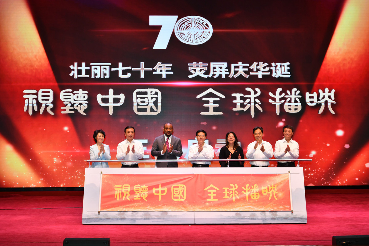 Nie Chenxi (center), head of the National Radio and TV Administration, presides over a ceremony in Beijing with officials from China, Ghana and the Philippines. [Photo provided to chinadaily.com.cn]