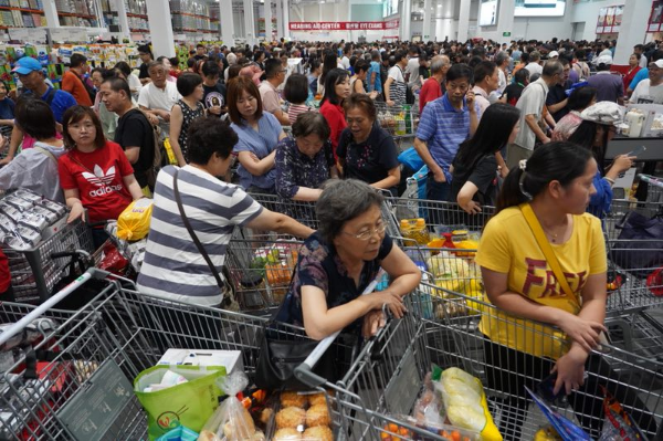 Customers wait the cashier in Costco's newly-open Shanghai outlet on Aug 27, 2019. [Photo by Gao Erqiang/Chinadaily.com.cn]