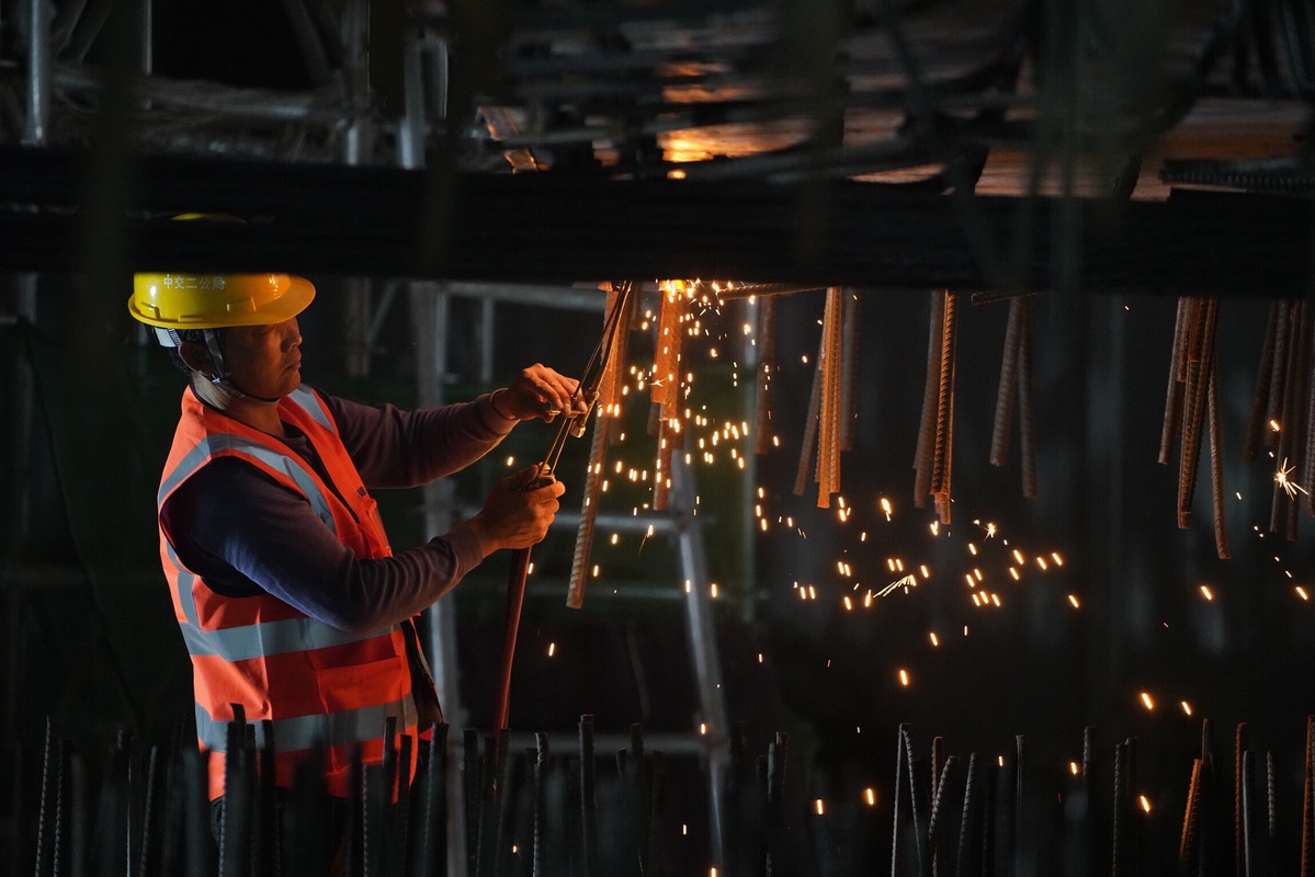 A railway builder works at the construction site of a swivel railway bridge of Beijing-Xiongan intercity high-speed railway while the bridge is being rotated to its targeted position across the Tianjin-Baoding high-speed railway in Xiongan New Area, North China's Hebei province, Aug 27, 2019. [Photo/Xinhua]