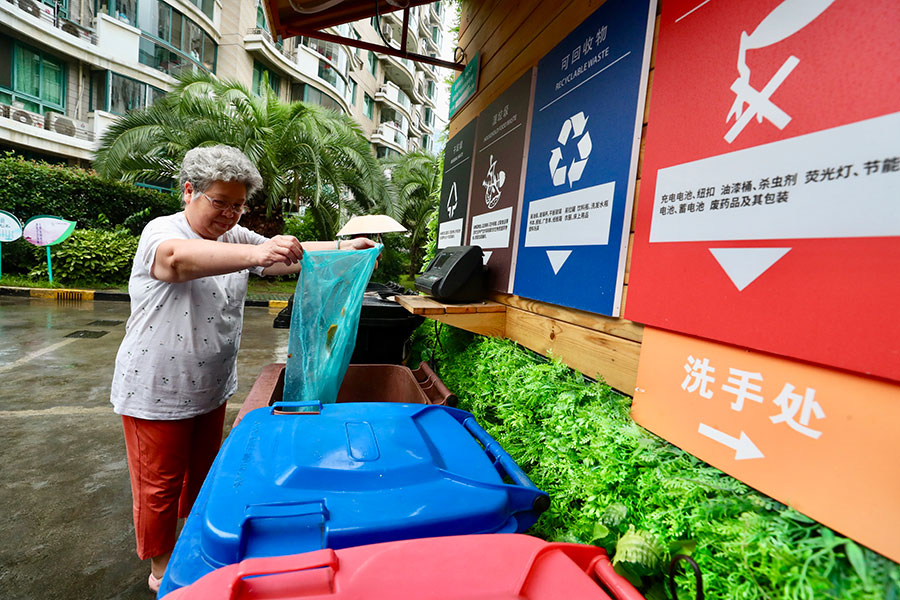 Chen Xiali, 70, puts sorted garbage into appropriate rubbish bins at a community in Hongkou district, Shanghai, on Aug 29, 2019. [Photo by Zhu Xingxin/chinadaily.com.cn]