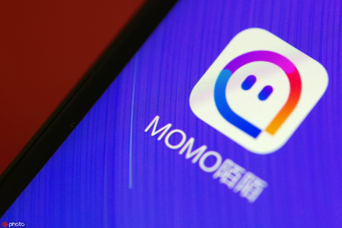 The homepage of Momo app is displayed in a photograph. [Photo/IC]