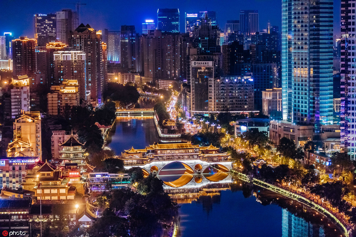 A night view of Chengdu's traditional Chinese architecture amidst modern skyscrapers and high-rise buildings along the Jinjiang River in Chengdu, Sichuan province, on Aug 24, 2018. [Photo/IC]