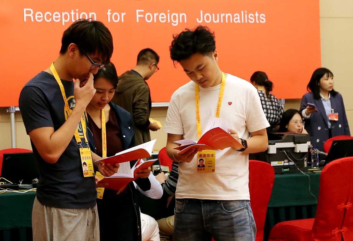 Journalists pick up their reading materials at the media center for the celebration of the 70th anniversary of the People's Republic of China on Sept 23, 2019. [Photo by Wang Zhuangfei/chinadaily.com.cn]