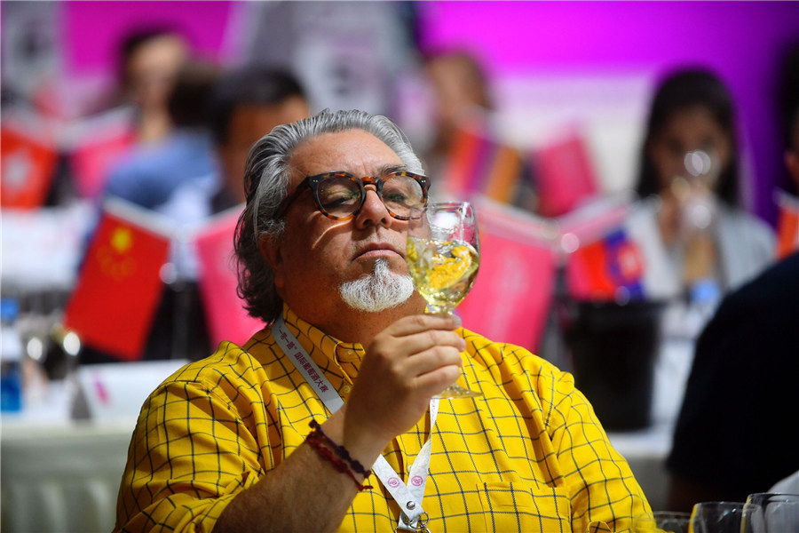 A judge observes a glass of wine during the 2019 Belt and Road International Wine and Spirit Competition, on Sept 25 in Yinchuan, Ningxia Hui autonomous region. [Photo by Li Jing/for chinadaily.com.cn]