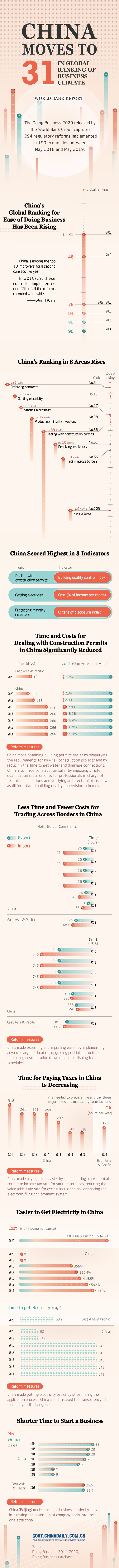 Editor's note: China carried out a record eight business reforms during the 12 months to May 1 and ranked 31st globally on the ease of doing business rankings with a score of 77.9 out of 100, according to the World Bank Group's Doing Business 2020.
