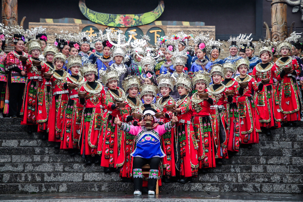Dressed in colorful ethnic clothing, Miao young women greet a male visitor with the traditional high mountain and flowing water toast, Oct 26, 2019. [Photo provided to chinadaily.com.cn]