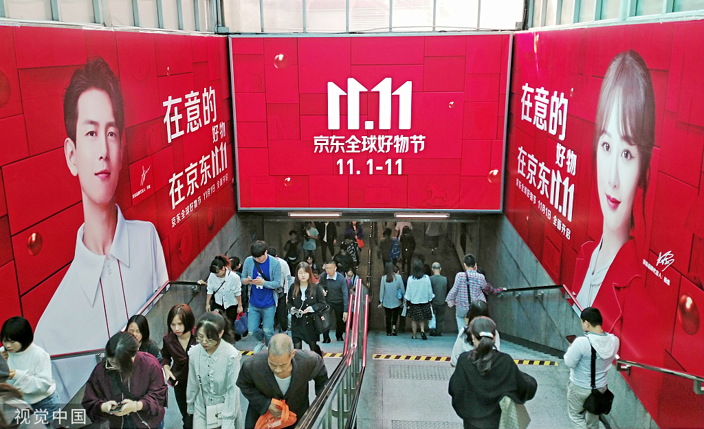E-commerce heavyweight JD's advertisements for the Double 11 shopping frenzy are seen at the entrance a metro station in Shanghai. JD reported its accumulated sales during the shopping carnival held from Nov 1 to Nov 11 reached 204.4 billion yuan this year. [Photo/VCG]