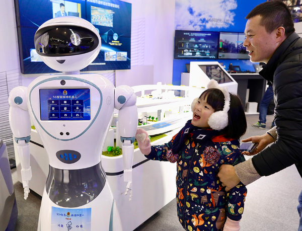 Visitors interact with a 5G enabled robot during a tech expo in Beijing on Nov 20, 2019. [Photo/China Daily by Zhu Xingxin]