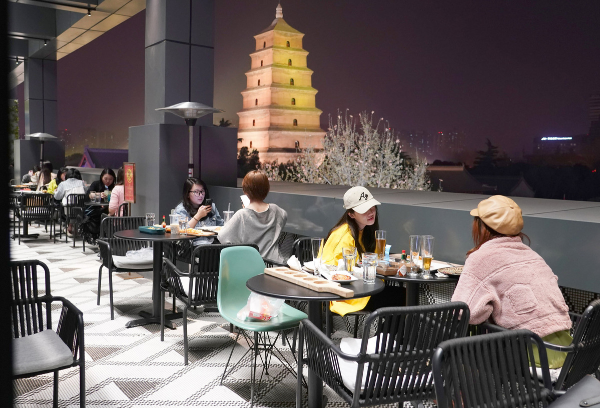 People have dinner on the terrace of a restaurant next to the Dayan Pagoda Square in Xi'an, Shaanxi province, as businesses reopen on March 23, 2020. [Photo/Xinhua]