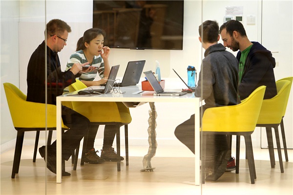 Employees take part in a meeting in Shanghai. [Photo provided to China Daily]