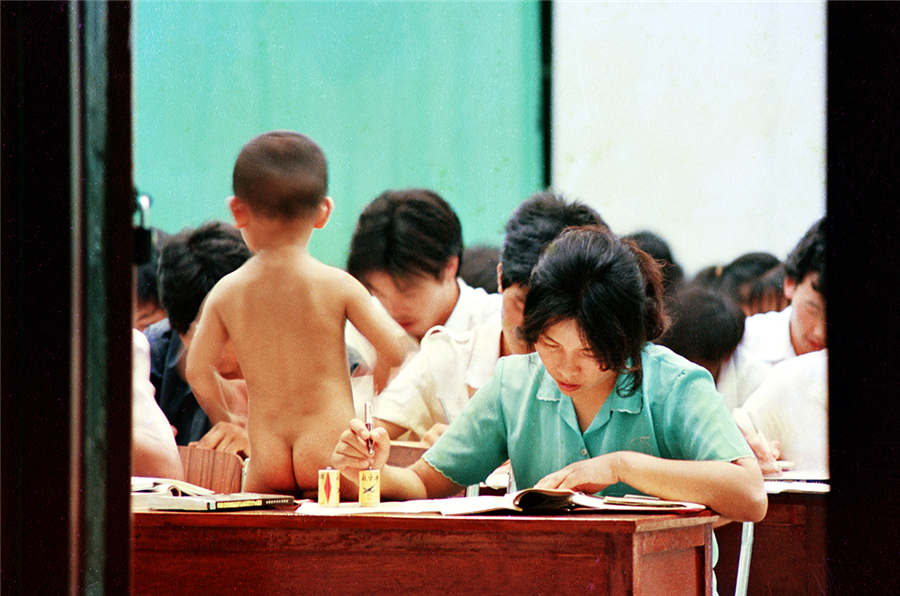 A mother brings her son, who sits bare-bottomed on a desk, to a night university in 1984. [Photo by Zhou Shunbin/cpanet.org.cn]