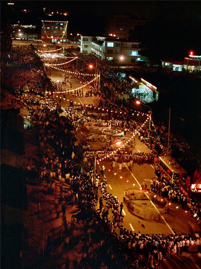 In 1990 an evening gala celebrating the 10th anniversary of the establishment of the Shenzhen Special Economic Zone took place on the newly built Hongli Road. It is said that 100,000 people danced on the road that night. [Photo by Zhou Shunbin/cpanet.org.cn]