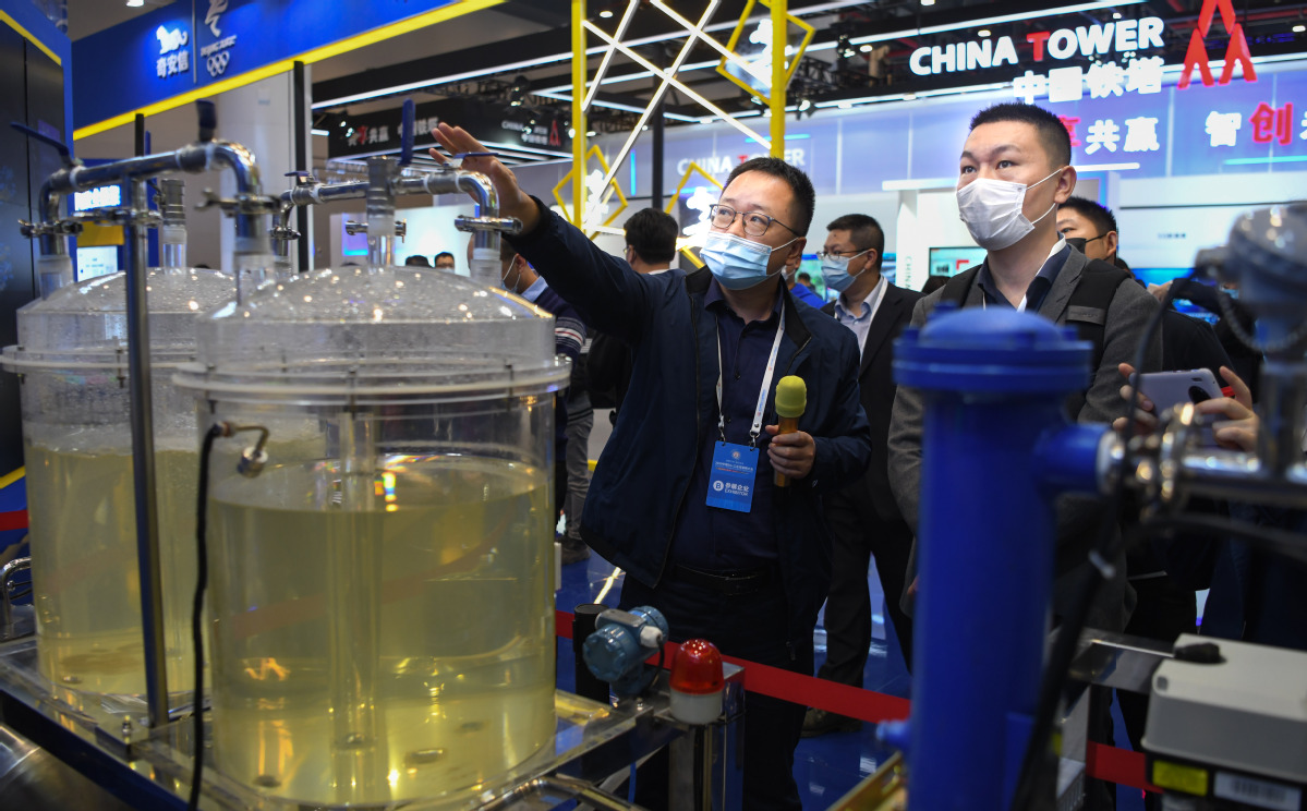A visitor (right) learns about a set of chemical production control systems during the China 5G+ Industrial Internet Conference in Wuhan, Central China's Hubei province, on Nov 19, 2020. [Photo/Xinhua]