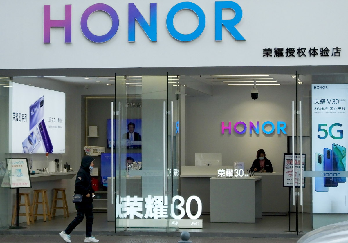 A pedestrian walks past a mobile phone shop of Honor in Yichang, Hubei province. [Photo by Liu Junfeng/For China Daily]