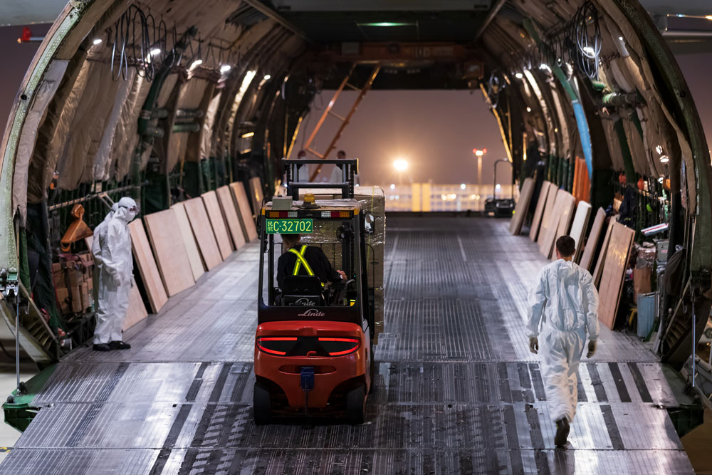 Face masks, testing kits and ventilators were flown from the airport to other parts of the world to help people in need at a time when the pandemic was being brought under control in China but was raging elsewhere.