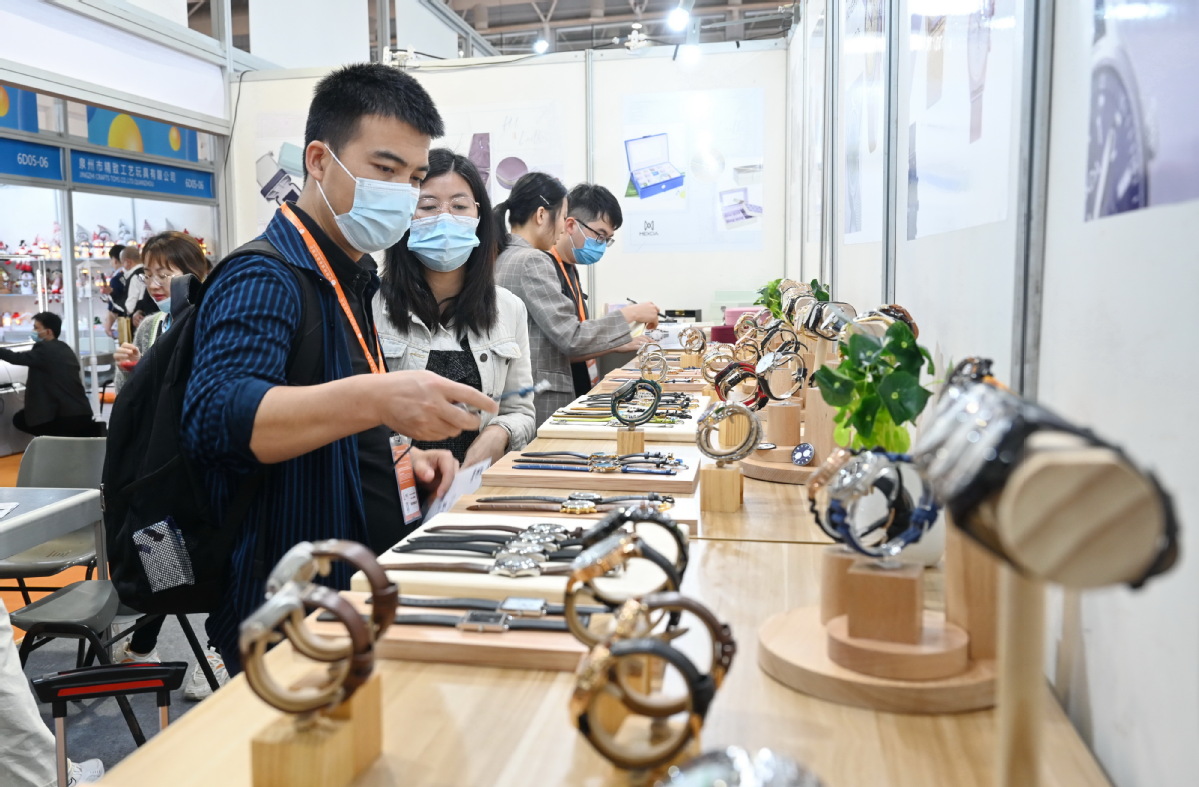 People visit a stand showcasing watches at the China Cross-border E-commerce Trade Fair in Fuzhou, East China's Fujian province, on March 18, 2021. [Photo/Xinhua]