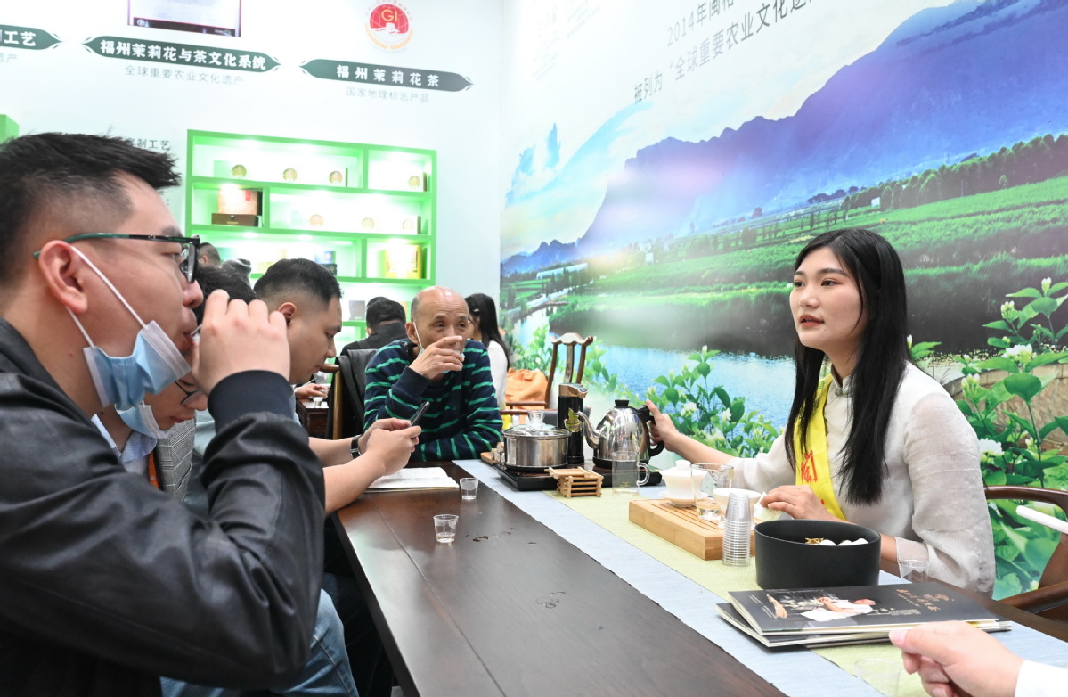 A staff member, right, introduces jasmine tea at the China Cross-border E-commerce Trade Fair in Fuzhou, East China's Fujian province, on March 18, 2021. [Photo/Xinhua]