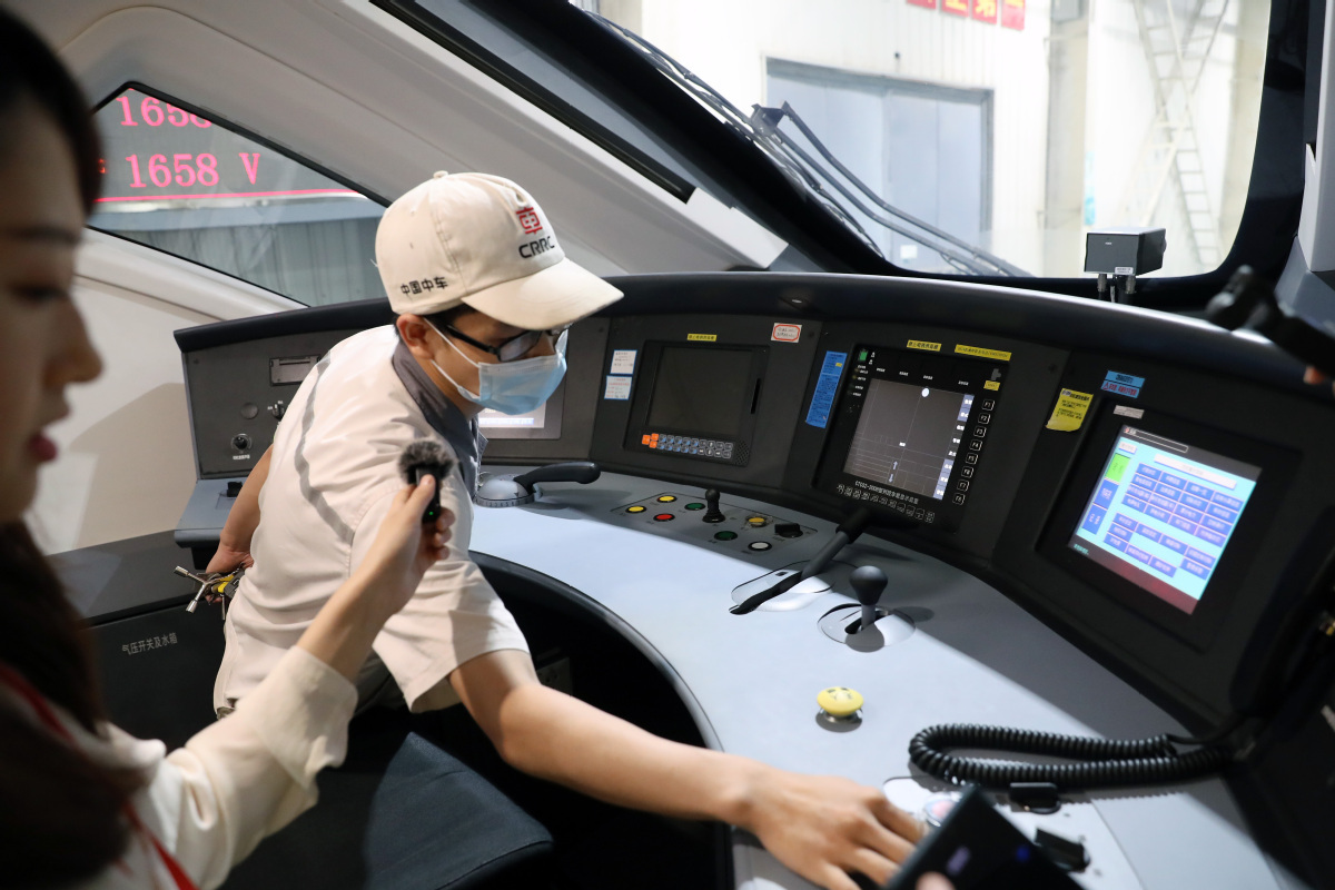 A worker shares information on CRH trains at the workshop of CRRC Guangdong Co Ltd in Jiangmen, South China's Guangdong province, on April 18, 2021. [Photo by Wang Zhuangfei for chinadaily.com.cn]