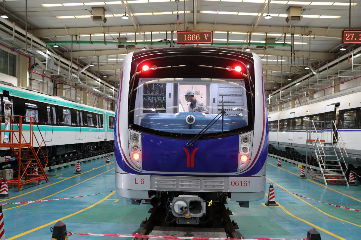 Railway trains are seen at the workshop of CRRC Guangdong Co Ltd in Jiangmen, South China's Guangdong province, on April 18, 2021. [Photo by Wang Zhuangfei for chinadaily.com.cn]
