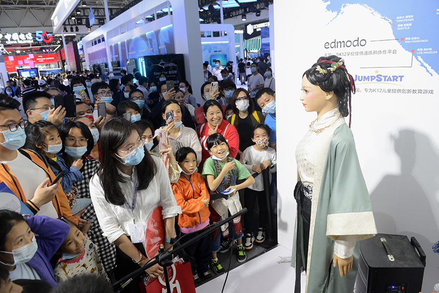 A robotic teacher is on display at the digital achievement exhibition during the 4th Digital China Summit in Fuzhou, Fujian province, on April 25, 2021. [Photo/IC]