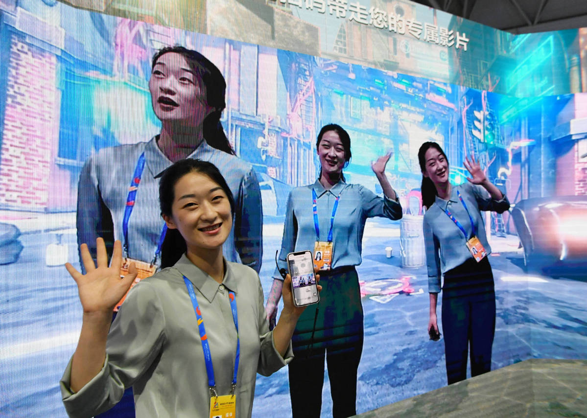 A cloud platform using image matting technology can realize three "selves" greet each other in real-time at the digital achievement exhibition during the 4th Digital China Summit in Fuzhou, Fujian province, on April 25, 2021. [Photo/Xinhua]