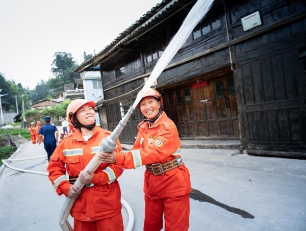A female voluntary fire brigade trains in Mushan village, Tianzhu county, Southwest China's Guizhou province. [Photo by Jin Kewen/For chinadaily.com.cn]