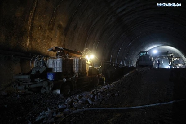 Tunnel drilling machines work inside the Yanjiazhai tunnel of the Guiyang-Nanning high-speed railway in Dushan county, Southwest China's Guizhou province, June 14, 2021. [Photo/Xinhua]
