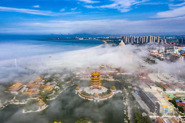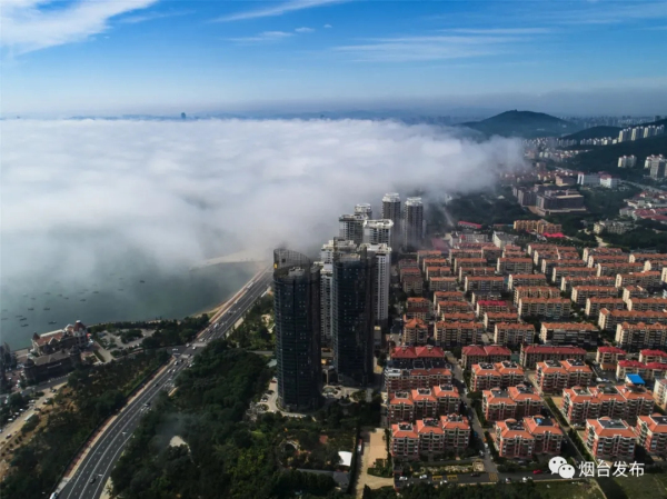 Photo taken on July 22, shows buildings in Yantai piercing through a thick layer of advection fog. Advection fog is common at sea when warm air meets cool waters. [Photo/WeChat Account: yantaifabu]