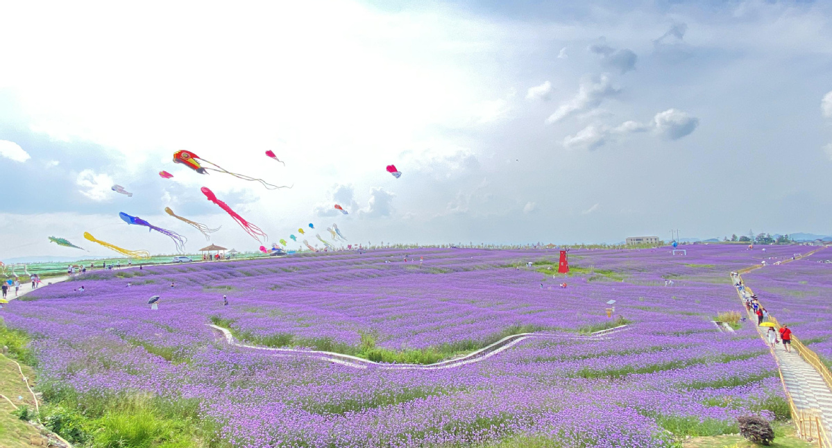 Kites fly over the the purple flower sea at Gaopo town. [Photo/IC]