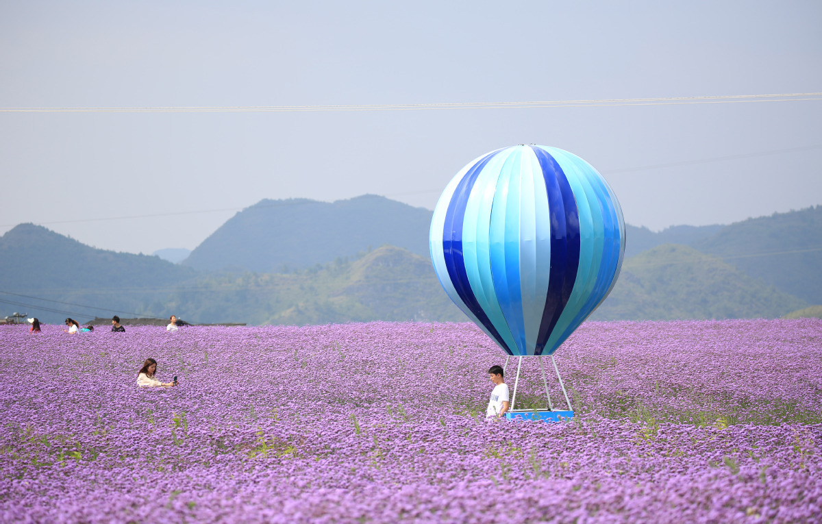 Tourists take photos of a model balloon among the purple flower sea at Gaopo town in Guiyang, Guizhou province on Aug 8, 2021. [Photo/IC]