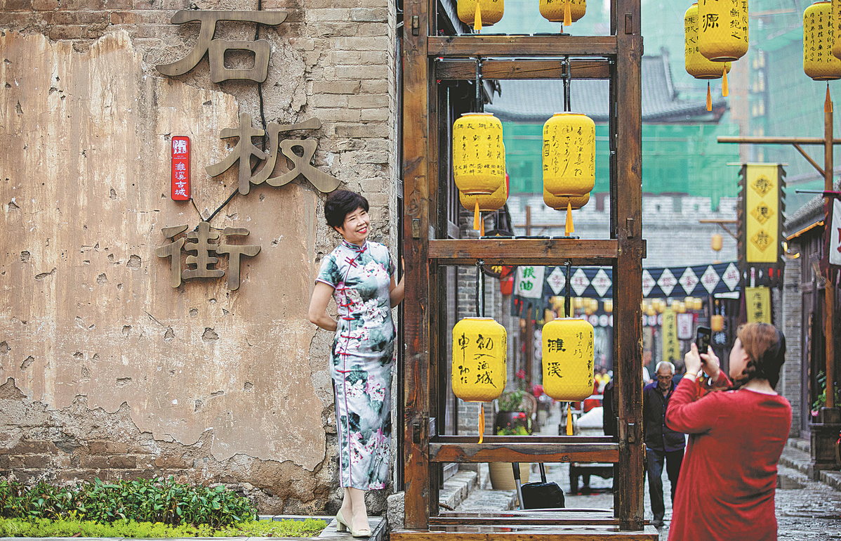 A tourist poses for photographs on an old street in Suixi county of Huaibei, Anhui province. Local authorities encourage a tourism model that combines tours of old streets, learning about intangible cultural heritage and tasting street food, in a bid to give a new lease on life to the old streets. [Photo by Wang Wen/for China Daily]