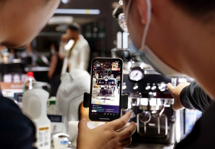 Staff members promote coffee machines via livestreaming at the Consumer Goods Exhibition Area of the 4th China International Import Expo (CIIE) in Shanghai, Nov 9, 2021. [Photo/Xinhua]