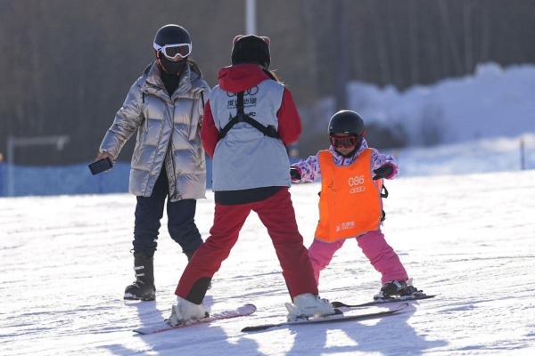 A group of young skiers and snowboarders at Changbaishan International Resort in Baishan, Jilin province, enjoy the snow with their parents and coaches. [Photo by Xu Chang/For chinadaily.com.cn]