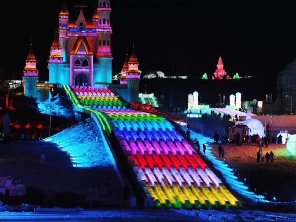Magnificent illuminated ice and snow sculptures are set up in the million-square-meter Changchun Ice and Snow New World, as well as a whole host of entertainment facilities. [Photo provided to chinadaily.com.cn]